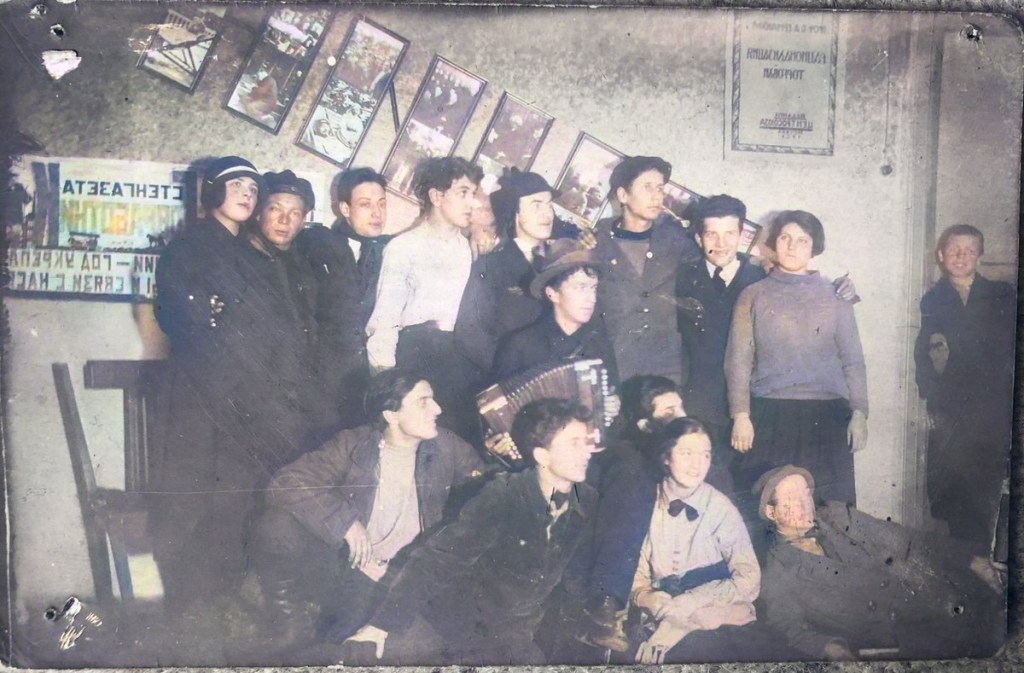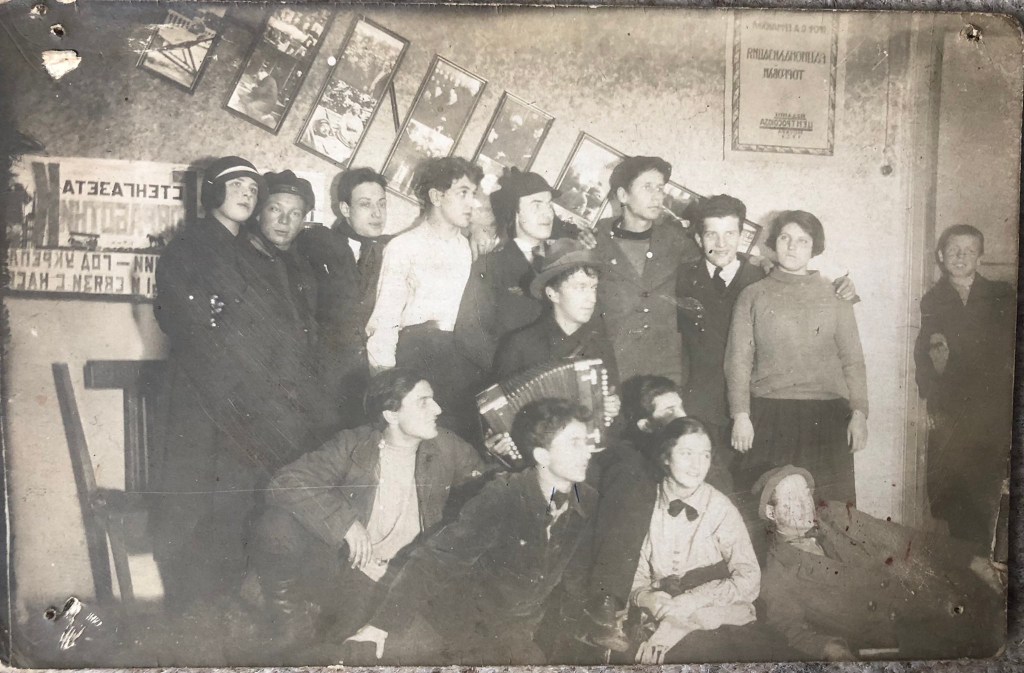 However, it is not the idea of espionage that interests me particularly. Still less the movement of textiles, timber and coal across the Baltic to the benefit of British commerce. It is this photograph that I found amongst hundreds of others in an old suitcase in my mother’s loft. A lively group of young people assembled in a shabby room adorned with agitprop posters and photos of Lenin. Their style of dress ranges from the bohemian to the Bolshevik. The majority of the group are looking towards their left- it appears that someone else is taking a group portrait while a second photographer caught this image from another angle. A couple of the figures stare out in other directions in slight confusion. Despite this there is a distinct sense of that much maligned word ‘comradeship’. One of the young men carries an accordion and I suspect that there has been quite a bit of drinking going on. A much younger boy looks on grinning in the doorway. I love this photograph.