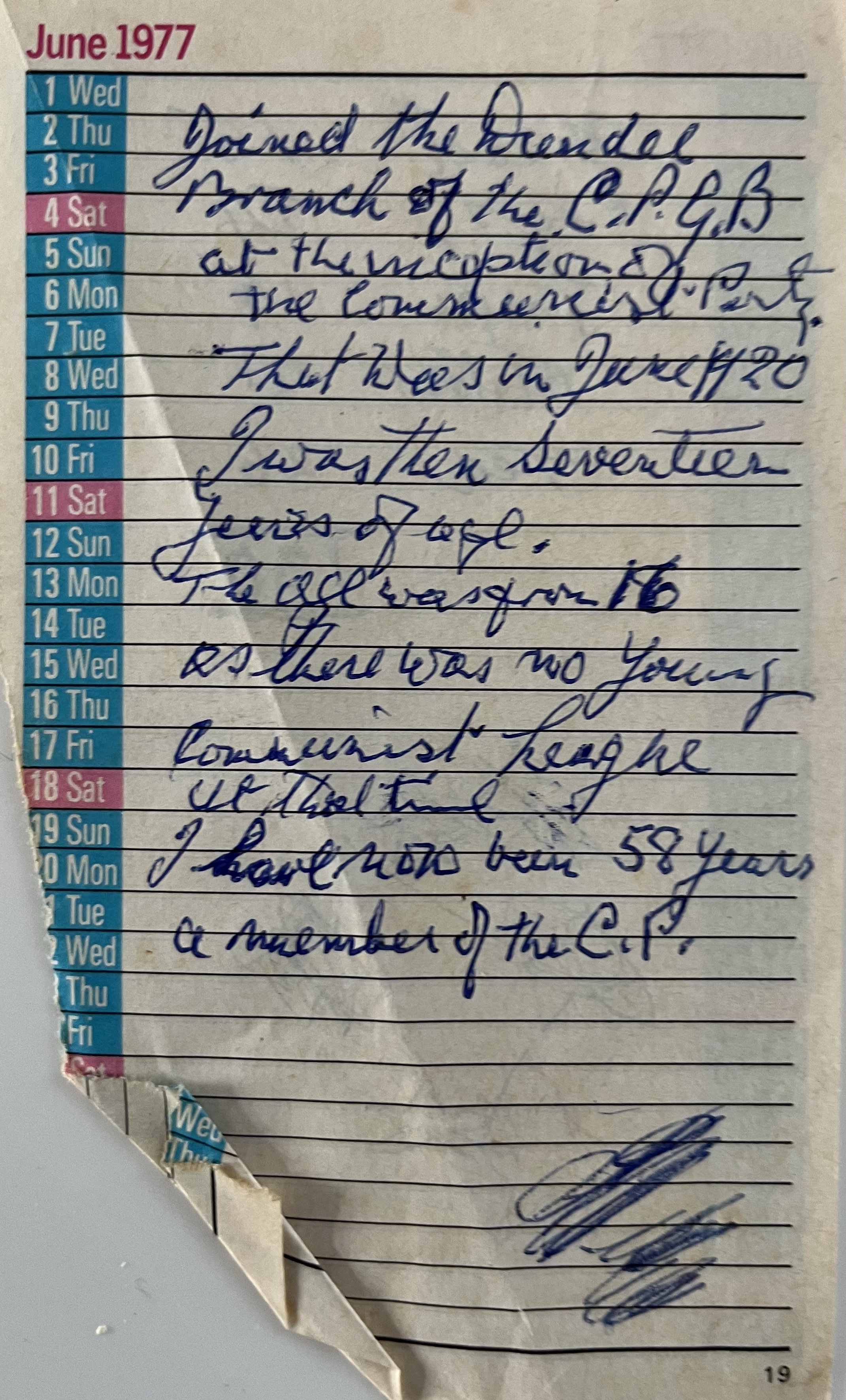 Bob who had been a joiner and a cabinetmaker in Dundee, was a foundation member of the British Communist Party in 1920. He and his wife, Meg, became honoured guests in my house shortly after that first meeting and we spent many Sundays visiting them. With Meg’s death in the early 1950s and his advancing age- for he was over sixty when I first put my head round his door- his life took a melancholy turn, not made happier by retirement and the gradual onset of blindness, so that I visited him as often as I could and he would come to us on Christmas Day. At one point I took him to see an ophthalmologist who told him that his eyes had done their work and there was no cure for his failing sight.
