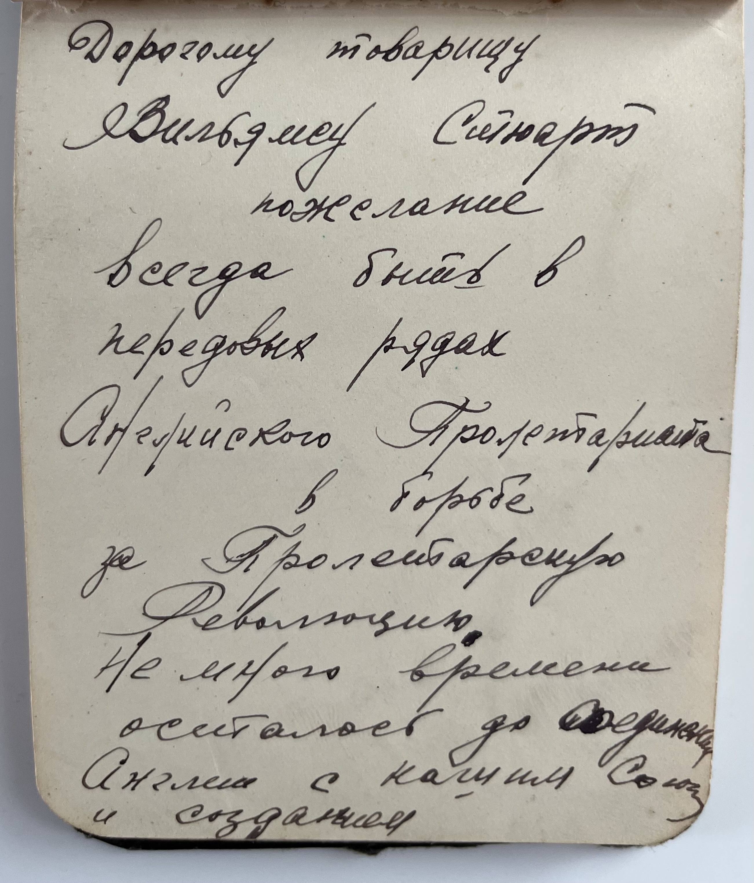 Wishing dear comrade William Stewart to be always in the leading line of the English proletariat fighting for the proletarian revolution. It’s not long until England is united with our union and until the creation of one powerful Union of Soviet Socialist Republics.