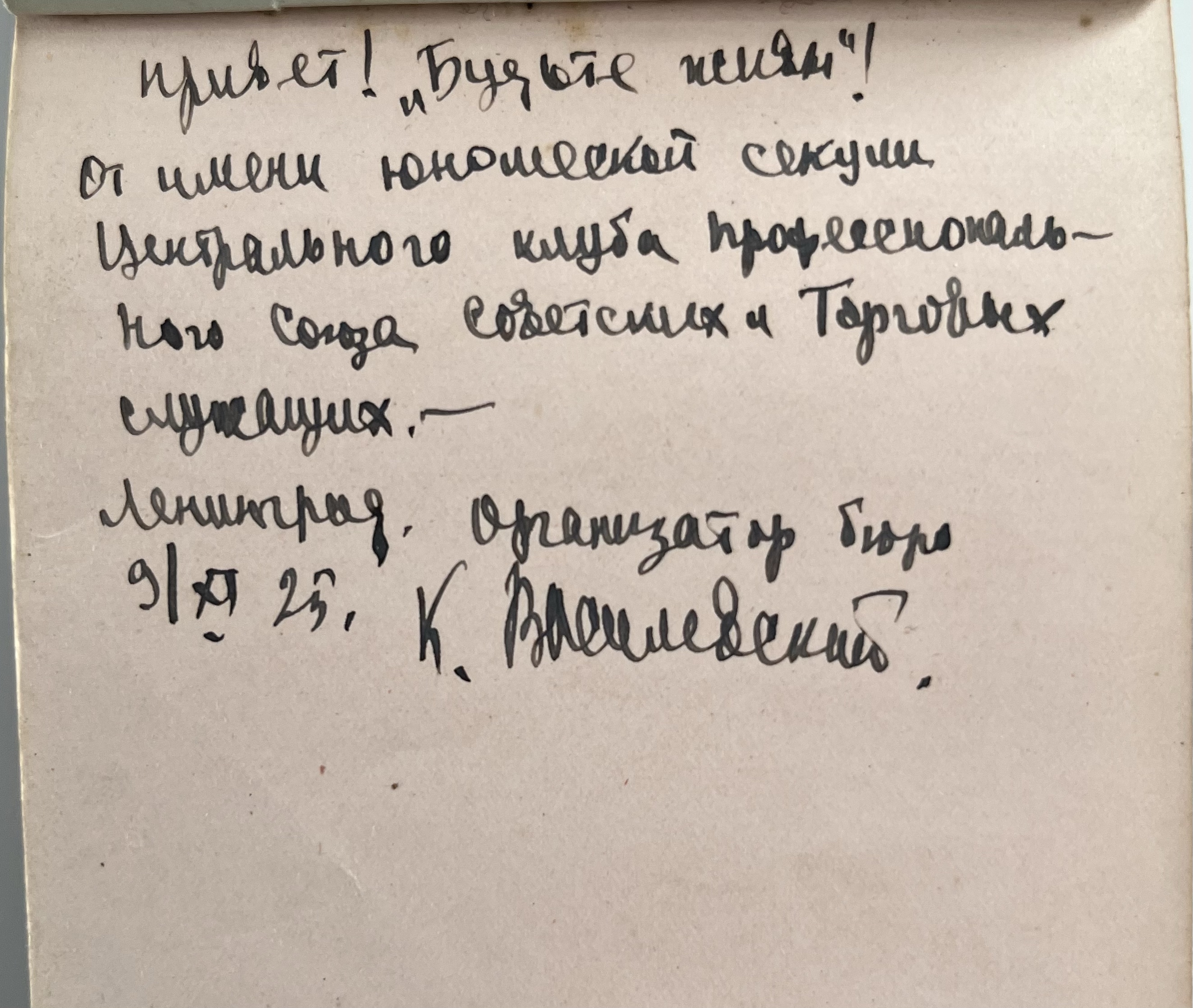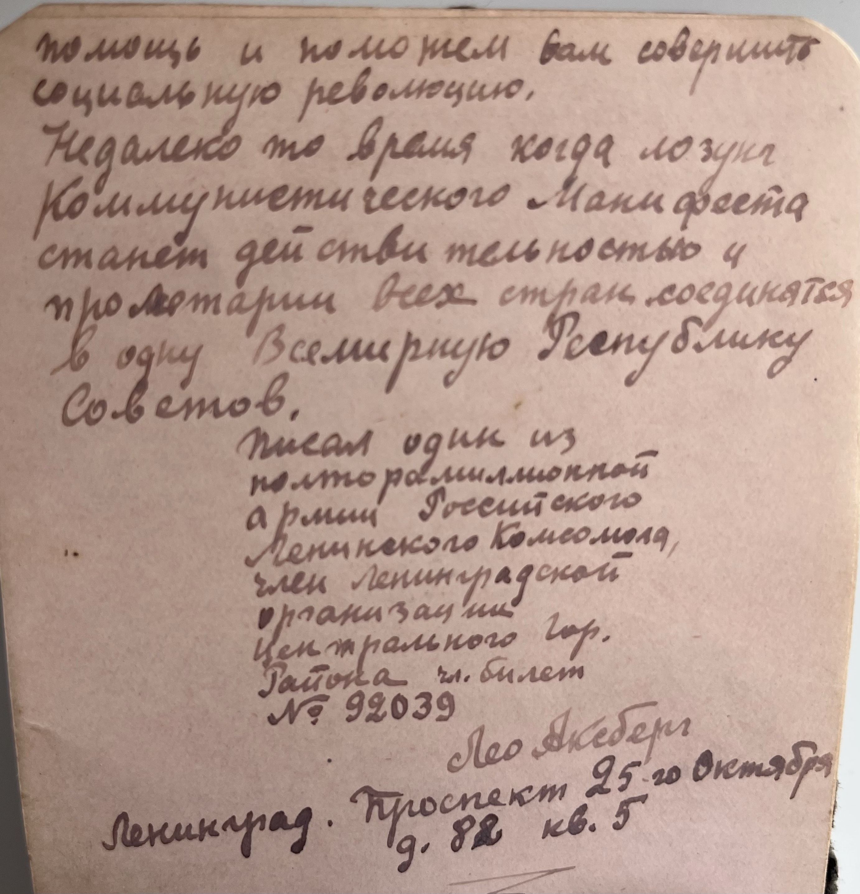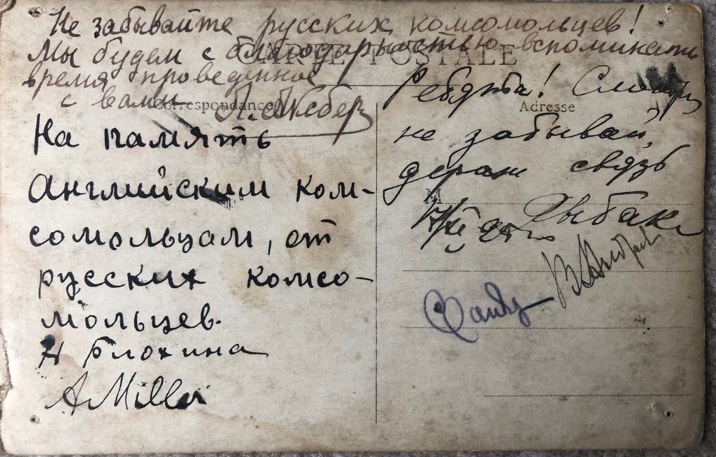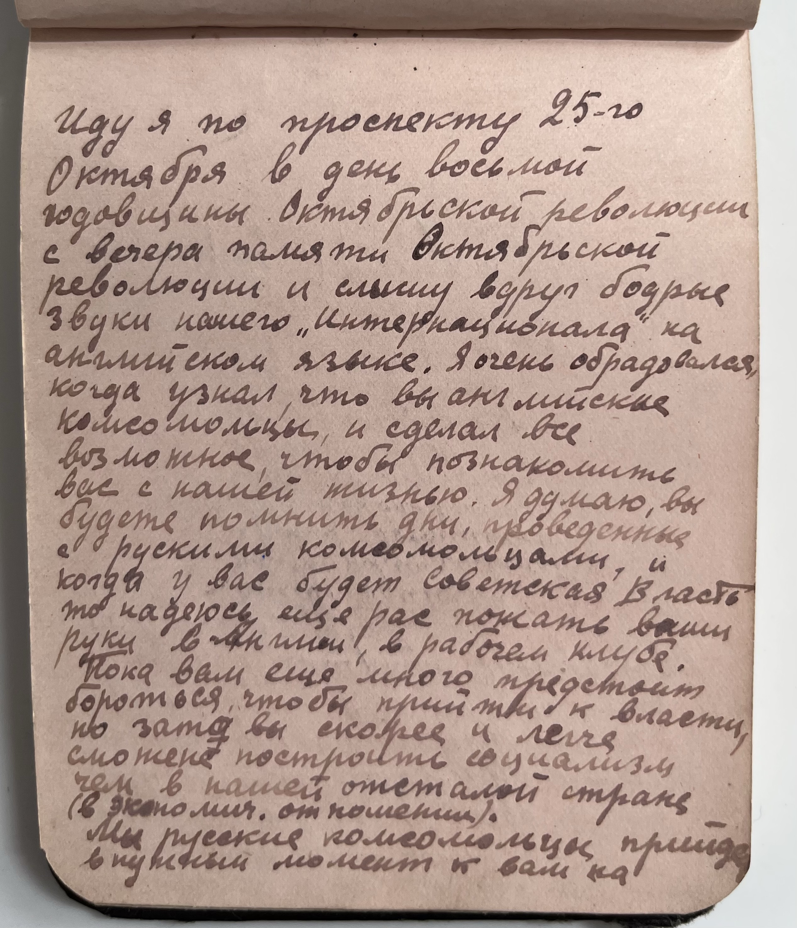 I am walking on Prospekt 25 Oktyabrya on the 8th anniversary of the October revolution, from the commemoration evening in honour of the October revolution and suddenly I hear energetic sounds of our Internationale in English. I was very happy to find out that you are English Komsomol members and did my best to show you our way of living. I think you will remember the days spent with Russian Komsomol members, and when you have Soviets in power I hope to shake handswith you once again in England in a workers’ club. So far you have a lot of fight on your hands to reach power, but you will be able to build socialism quicker and easier compared to our backward country (in the economic sense). We, Russian Komsomol members, will come to help you when needed and will help you to carry out a social revolution.
