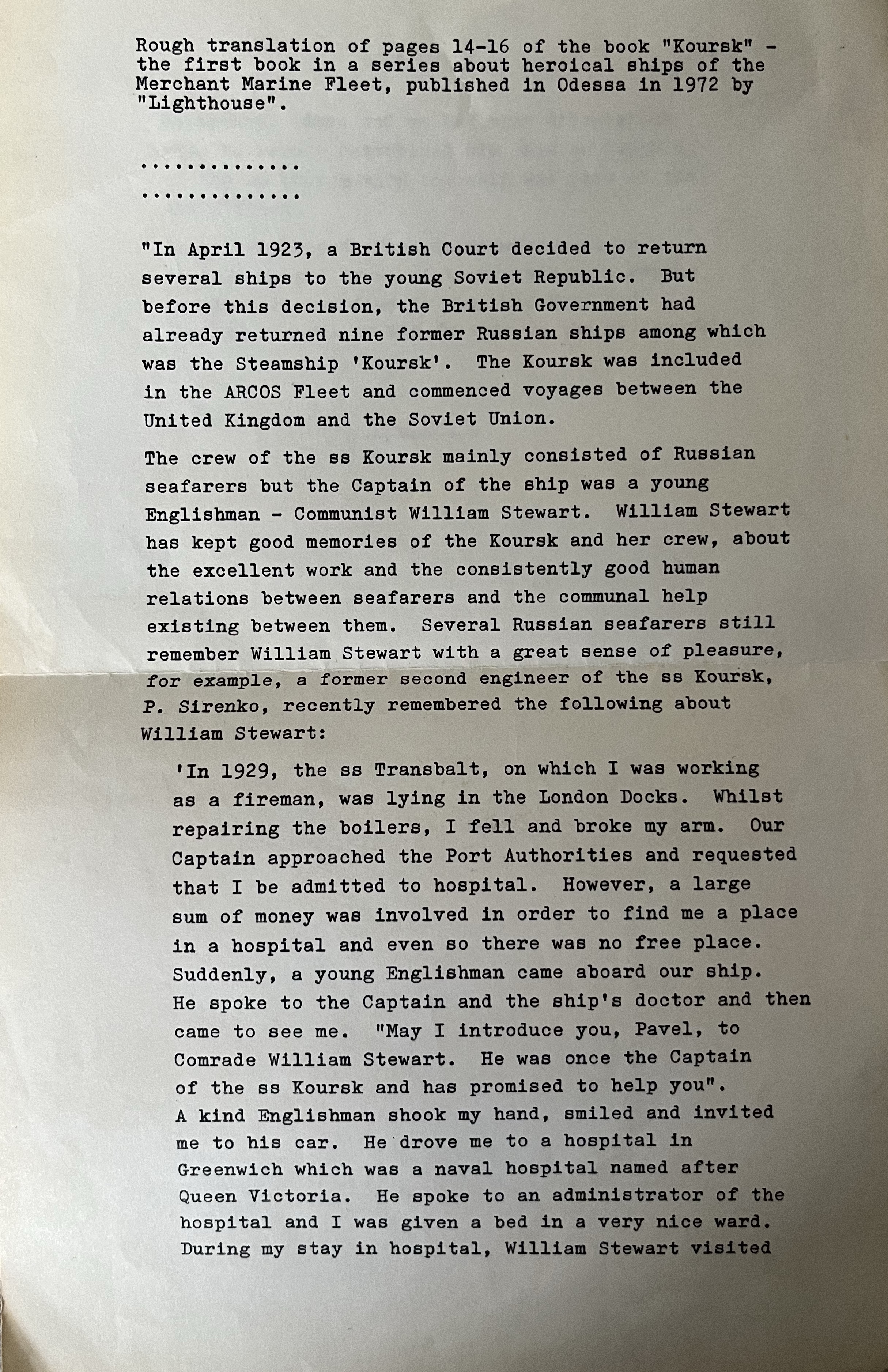 Bill obviously made firm friends on these trips. Here’s a translation from a book on the SS Koursk published in Odessa in 1972 in a series about ‘heroical ships of the Merchant Marine Fleet’. I found it amongst all the jumble of letters and documents I’ve been sifting through. I think the translation is, as the writer admits, only rough as I don’t think Comrade William Stewart ever reached the rank of captain.