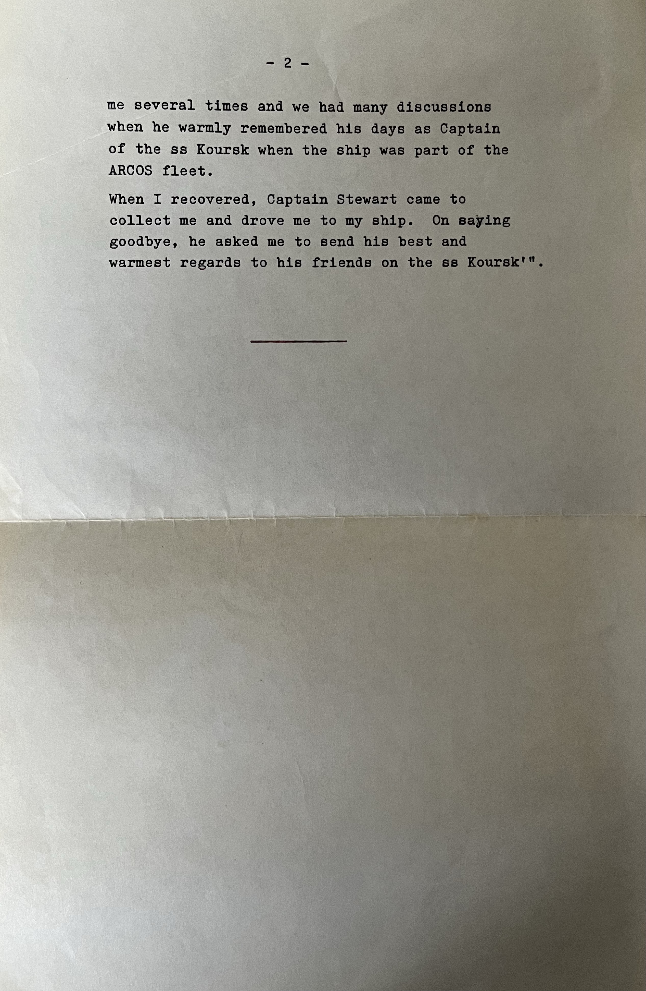 When I recovered, Captain Stewart came to collect me and drove me to my ship. On saying goodbye, he asked me to send his best and warmest regards to his friends on the SS Koursk'”