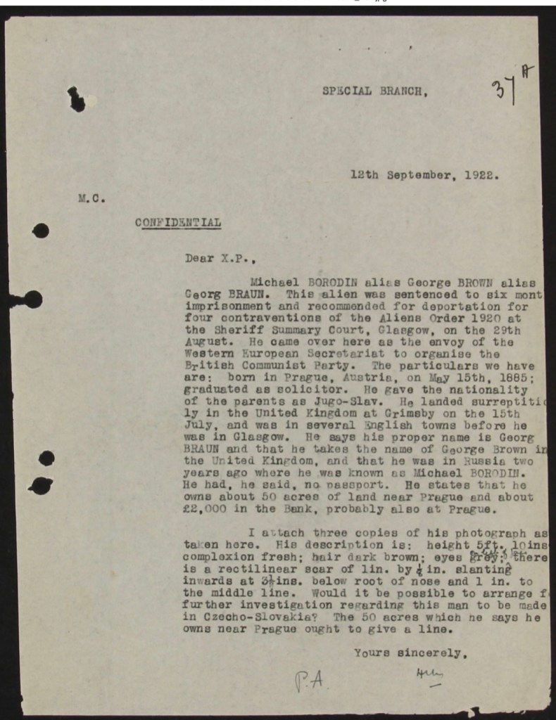 Initial investigations found that Kaminsky was much more than a secretary. In a letter dated 27th March 1930 Captain Guy Liddell, then of Special Branch, wrote to Oswald Allen Harker in MI5 with the following information: