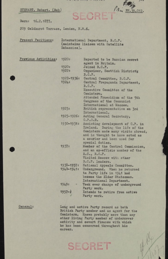 The document above is taken from the MI5 files now held at the National Archives in Kew. It’s from 1957 and gives a pretty comprehensive overview of Bob Stewart’s career in the Communist Party so far. Bob celebrated his eightieth birthday that year and most of the material the security services picked up from tapped telephones and bugged offices at the CPGB HQ in King Street, Covent Garden relate to him aiming to wind down and retire. There’s a decent summary of his professional life at the end.