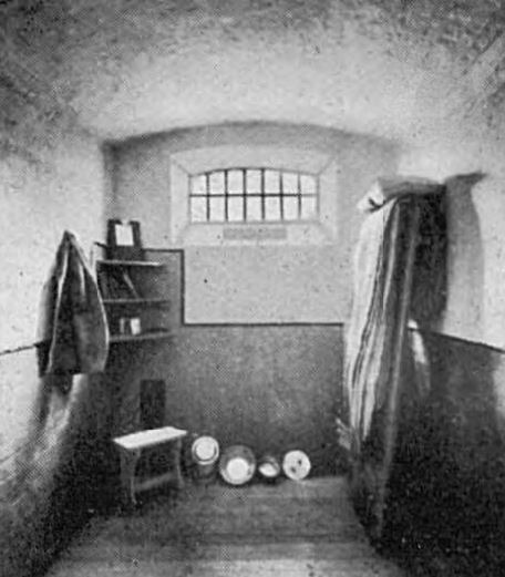 My new abode was the usual brick-walled domicile, thirteen feet by about seven feet. Its furnishing, a six feet by thirty-inch board bed. Top and bottom sheets of canvas, one or two blankets according to season, a bedcover, a small table under a pane of obscure glass through which a flicker of gaslight shone, sufficient to strain your eyes when reading. A small shelf for books, and a pint pot, a tin basin and a jug for water, a minute portion of soap, a very small weekly supply of toilet paper and a slop pot for natural necessities. A window in the outer wall with twenty-one very small panes of obscure glass. Woe betide any prisoner who was caught (as many were) trying to get a cock-eyed view of the outside world by standing on the stool provided to be sat on and not stood on. A copy of the prison regulations and diet sheet was hung on the wall. A mark on the centre of the wall, I learned, indicated where the prisoner should stand when the Governor made his inspection, at which time the prisoner must place his cap on top of his bed.