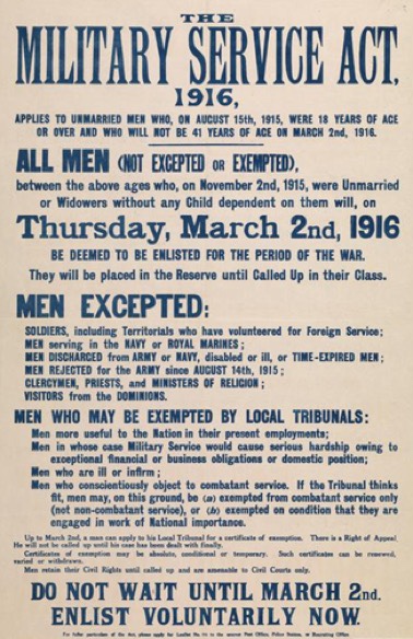 The Military Service Acts brought the big fight against conscription. In the true British tradition, unity was scorned-not one organisation but a whole number were in the struggle. There was the Anti-Conscription League, mainly fathered by the trade unions; the No-Conscription Fellowship; the Fellowship of Reconciliation; the Society of Friends. There were Socialist objectors, Christian