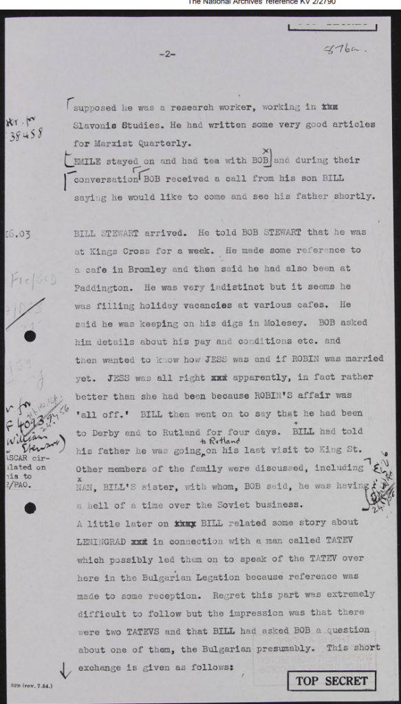 BILL STEWART arrived. He told BOB STEWART that he was at Kings Cross for a week. He made some reference to a cafe in Bromley and then said he had also been at Paddington. He was very indistinct but it seems he was filling holiday vacancies at various cafes. He said he was keeping on his digs in Molesey. BOB asked him details about his pay and conditions etc. and then wanted to know how JESS was and if ROBIN was married yet. JESS was all right apparently, in fact rather better than she had been because ROBIN’S affair was ‘all off’. BILL then went on to say that he had been to Derby and to Rutland for four days. BILL had told his father he was going on his last visit to King St. Other members of the family were discussed, including NAN, BILL’S sister, with whom, BOB said, he was having a hell of a time over the Soviet business.