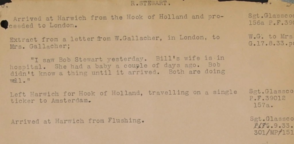 The first appearance is an extract from a letter written in 1933 by Red Clydeside hero and future Communist MP Willie Gallacher to his wife. He mentions Bob Stewart’s return from one of his many trips abroad and his surprise on his return to find out he had become a grandfather. The baby was our dad who was born a few weeks before.